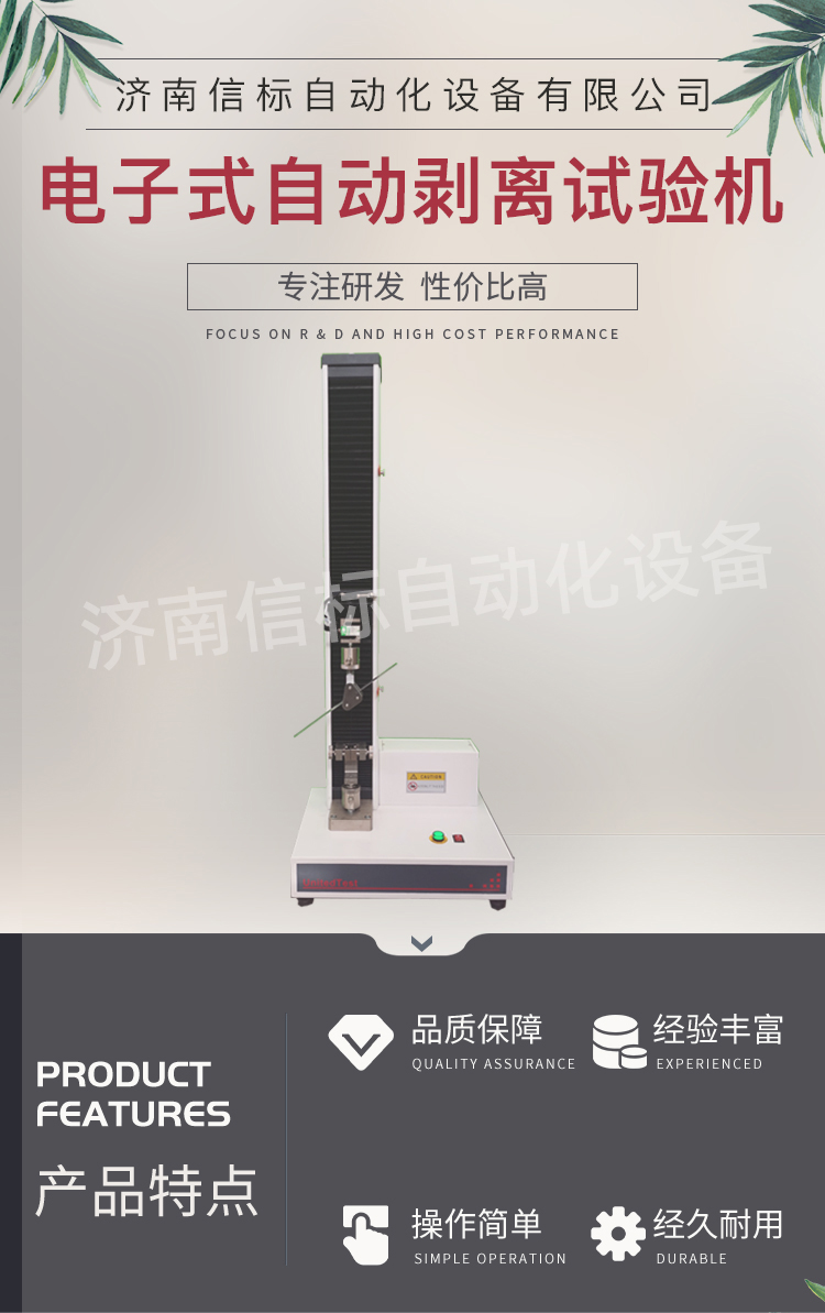 高強度膠黏劑膠帶浮棍法90度180度剝離強度試驗機主要功能及特點: 1、主機: 1.1調(diào)速系統(tǒng)采用伺服電機和自主研發(fā)減速系統(tǒng),性能穩(wěn)定可靠,具有過流、過壓、過載等保護裝置。調(diào)速范圍可達0.05~500mm/min。 1.2傳動部分采用圓弧同步齒形帶,精密絲杠副傳動,傳動平穩(wěn),噪音低,傳動效率高。 1.3萬向節(jié)采用十字插銷結(jié)構(gòu),而且具有擺角限制功能,一方面便于試樣夾持,保證試驗同心度,另一方面很好的消除了不規(guī)則試樣對傳感器的影響。 2、控制系統(tǒng)、操作軟件及數(shù)據(jù)處理系統(tǒng) 2.1計算機控制系統(tǒng),具有集成度高、性能穩(wěn)定、調(diào)整方便等優(yōu)點??梢詫嶒灁?shù)據(jù)進行實時采集,對實驗特性曲線實現(xiàn)實時動態(tài)顯示,試驗數(shù)據(jù)文件能以Access常用數(shù)據(jù)庫或SQLserve大型數(shù)據(jù)庫的方式保存,方便實現(xiàn)客戶的資源共享及網(wǎng)絡管理,以及用戶的再分析。對于用戶自定義的各種word2000報表,該軟件可輕松實現(xiàn)訪問,解決了不同用戶或同一用戶在不同時期對試驗報表有不同需要的難題。該軟件可處理試驗力、位移、時間、變形的原始數(shù)據(jù)及由此派生的曲線。