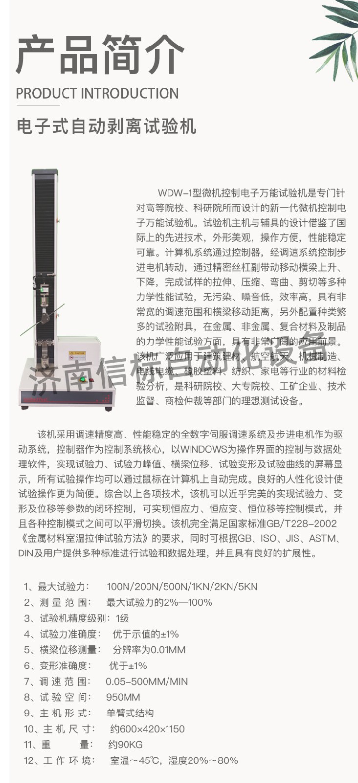 高強度膠黏劑膠帶浮棍法90度180度剝離強度試驗機主要技術(shù)指標: 1、最大試驗力: 100N/200N/500N/1KN/2KN/5KN 2、測 量 范 圍: 最大試驗力的2%—100% 3、試驗機精度級別:1級 4、試驗力準確度: 優(yōu)于示值的±1% 5、橫梁位移測量: 分辨率為0.01mm 6、變形準確度: 優(yōu)于±1% 7、調(diào) 速 范 圍: 0.05-500mm/min 8、試 驗 空 間: 950mm 9、主 機 形 式: 單臂式結(jié)構(gòu) 10、主 機 尺 寸: 約600×420×1150 11、重 量: 約90Kg 12、工 作 環(huán) 境: 室溫~45℃,濕度20%~80%