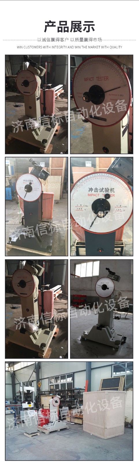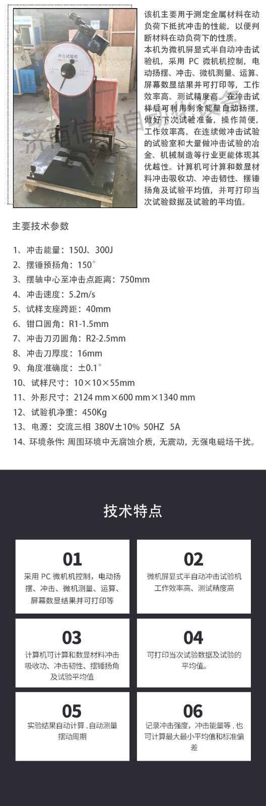 按照 GB/T3808-2018 (擺錘式?jīng)_擊試驗機的檢驗)及 ISO148-2(金屬材料擺錘式夏比沖擊試驗第二部分,試驗機檢定)、ASTM E23 相關(guān)標(biāo)準(zhǔn)生產(chǎn)制造符合 GB/T229-2020(金屬夏比缺口沖擊試驗方法)、ISO148 (金屬材料擺錘式夏比沖擊試驗)、JJG 145-2007 (擺錘式?jīng)_擊試驗機檢定規(guī)程) 四、主要技術(shù)指標(biāo): 1、沖擊能量:150J、300J 2、擺錘預(yù)揚角:150° 3、擺軸中心至沖擊點距離:750mm 4、沖擊速度:5.2m/s 5、試樣支座跨距:40mm 6、鉗口圓角:R1-1.5mm 7、沖擊刀刃圓角:R2-2.5mm 8、沖擊刀厚度:16mm 9、角度準(zhǔn)確度:±0.1° 10、試樣尺寸:10×10×55mm 11、外形尺寸:2124 mm×600 mm×1340 mm 12、試驗機凈重:450Kg 13、電源:交流三相 380V±10% 50HZ 5A 14、環(huán)境條件:周圍環(huán)境中無腐蝕介質(zhì),無震動,無強電磁場干擾。 五、設(shè)備主要配置: 1、300焦耳主機一臺; 2、150J、300J 擺錘各一個 3、取擺傳動裝置一套(裝在主機上) 4、自動掛擺裝置一套(裝在主機上) 5、保險機構(gòu)一套(裝在主機上) 6、安全防護裝置一套 7、擺錘拆卸器一只 8、支座調(diào)校器一只 9、試樣對中器一只 10、聯(lián)想打印機一套 11、專用測量軟件一套 測控部分說明: Windows 平臺, 屏顯,鼠標(biāo)操作(操作窗口如下); 如果需要輸出實驗報告,需要安裝Microsoft Word或Excel版本至少為Office2003。 軟件支持多個擺錘. 記錄沖擊強度,沖擊能量等.也可計算最大最小平均值和標(biāo)準(zhǔn)偏差。 實驗結(jié)果自動計算. 自動測量擺動周期 實驗結(jié)果可根據(jù)客戶使用要求,提供通訊協(xié)議,滿足數(shù)據(jù)上傳,實現(xiàn)第三方遠程監(jiān)控