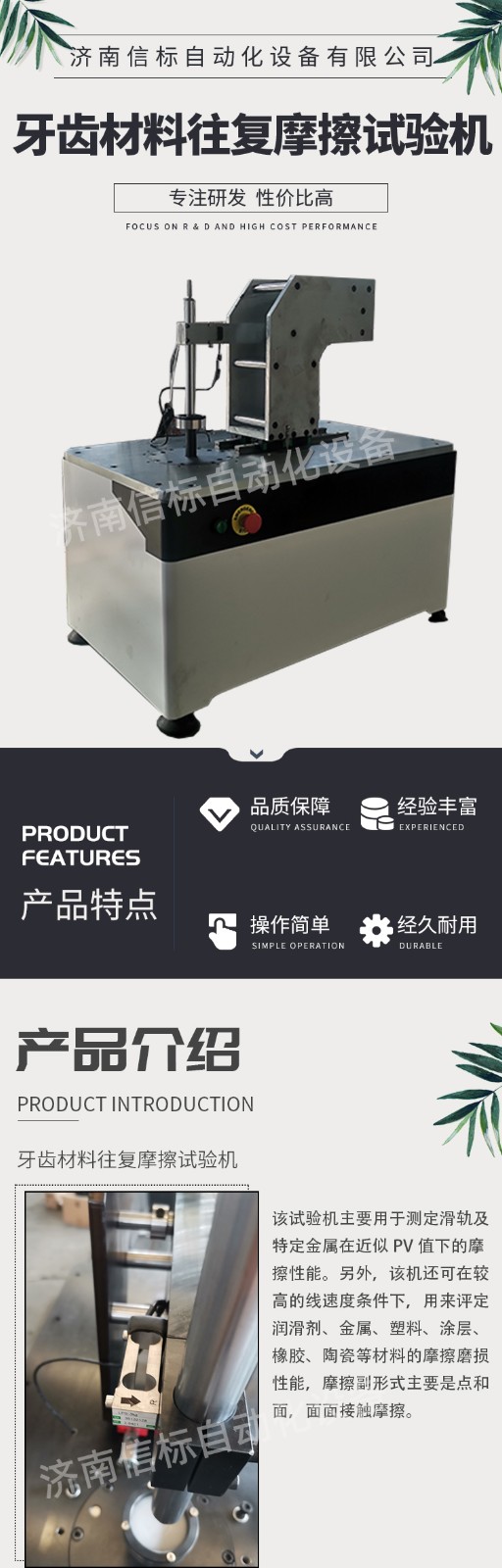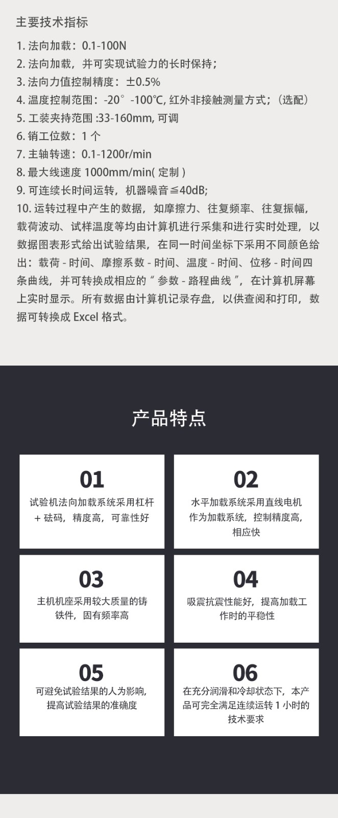 試驗機結(jié)構(gòu)原理 1.主要技術(shù)要求及滿足情況:(水平運動總成選配) 為滿足2的各項技術(shù)要求,本產(chǎn)品擬采用以下方案 3.1該試驗機由法向加載系統(tǒng)、水平杠桿,扭矩測力系統(tǒng),溫控系統(tǒng),其冷卻及潤滑裝置、電氣控制柜及計算機實時數(shù)據(jù)采集及控制系統(tǒng)(包括軟件)等部分組成; 試驗機主機主要由主機機座、水平機座、法向主軸及其驅(qū)動系統(tǒng)、試驗力施加裝置、摩擦扭矩及位移高精度傳感測量系統(tǒng)、試驗力測量及摩擦溫度測量系統(tǒng)等組成;試驗機法向加載系統(tǒng)采用杠桿+砝碼,精度高,可靠性好;水平加載系統(tǒng)采用直線電機作為加載系統(tǒng),控制精度高,相應快,主機機座采用較大質(zhì)量的鑄鐵件,固有頻率高,吸震抗震性能好,箱體座也是采用鐵件經(jīng)數(shù)控鏜加工后將電主軸牢固鎖緊在箱體座中,這樣可以提高加載工作時的平穩(wěn)性。 3.2冷卻及潤滑裝置的功能主要是對作動器進行冷卻和潤滑,以使作動器長時穩(wěn)定可靠工作。(適用于油品測試) 3.3計算機實時數(shù)據(jù)采集及數(shù)據(jù)處理控制系統(tǒng)是專門編制的控制軟件對各項試驗參數(shù)進行人為設定、采集、監(jiān)控及輸出的智能系統(tǒng),可避免試驗結(jié)果的人為影響,提高試驗結(jié)果的準確度。 3.5摩擦力的測量選用美國世銓公司的高精度力傳感器; 3.6在充分潤滑和冷卻狀態(tài)下,本產(chǎn)品可完全滿足連續(xù)運轉(zhuǎn)1小時的技術(shù)要求。 3.7本產(chǎn)品可進行“銷-盤”、“環(huán)-盤”“環(huán)-塊”等多種摩擦副的試驗,并可在干摩擦及有油潤滑狀態(tài)下工作;摩擦副形式及尺寸可按用戶要求設計,易于操作,裝卸試樣方便,并附專用工具等。 3.8試驗溫度的測量采用中科院產(chǎn)紅外非接觸測溫方式進行。 3.9根據(jù)技術(shù)要求,通過智能儀表及專門編制的計算機軟件對試驗運轉(zhuǎn)過程中產(chǎn)生的諸如摩擦力矩、載荷波動、摩擦溫升等試驗參數(shù)進行實時采集及處理,并給出相應的試驗曲線,可將試驗數(shù)據(jù)存盤并轉(zhuǎn)換成Excel表格形式以供查閱和打印輸出。
