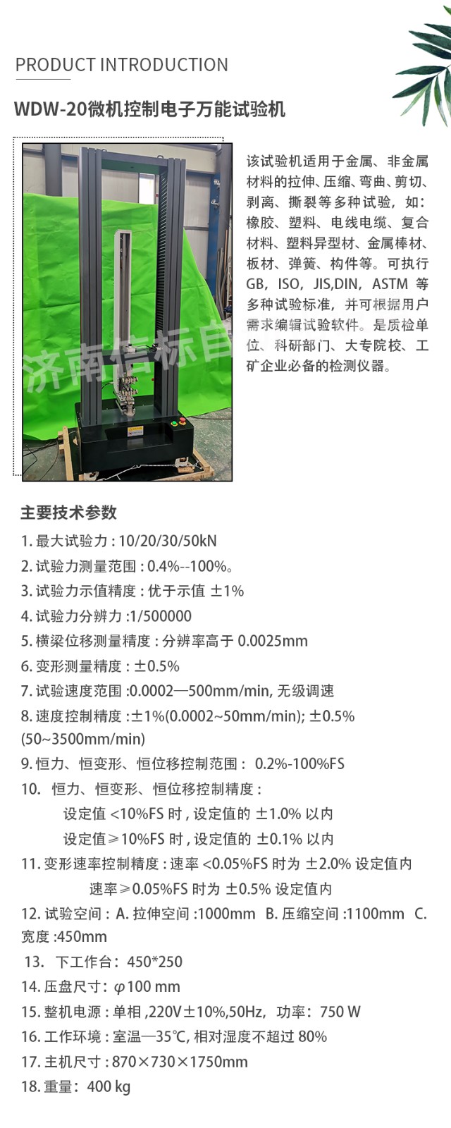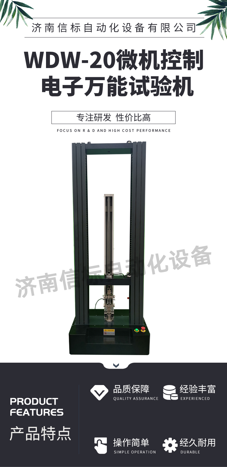 測(cè)量參數(shù): 1. 最大試驗(yàn)力: 10/20/30/50kN 2. 試驗(yàn)力測(cè)量范圍: 0.4%--100%。 3. 試驗(yàn)力示值精度:優(yōu)于示值±1% 4. 試驗(yàn)力分辨力:1/500000 5. 橫梁位移測(cè)量精度:分辨率高于0.0025mm 6. 變形測(cè)量精度: ±0.5% 7. 試驗(yàn)速度范圍:0.0002—500mm/min,無級(jí)調(diào)速 8. 速度控制精度:±1%(0.0002~50mm/min); ±0.5%(50~3500mm/min) 9. 恒力、恒變形、恒位移控制范圍: 0.2%-100%FS 10.恒力、恒變形、恒位移控制精度: 設(shè)定值<10%FS時(shí),設(shè)定值的±1.0%以內(nèi) 設(shè)定值≥10%FS時(shí),設(shè)定值的±0.1%以內(nèi) 11. 變形速率控制精度: 速率<0.05%FS時(shí)為±2.0%設(shè)定值內(nèi) 速率≥0.05%FS時(shí)為±0.5%設(shè)定值內(nèi) 12. 試驗(yàn)空間: A.拉伸空間:1000mm B.壓縮空間:1100mm C.寬度:450mm 13.下工作臺(tái):450*250 14. 壓盤尺寸:φ100 mm 15. 整機(jī)電源:單相,220V±10%,50Hz,功率:750 W 16. 工作環(huán)境:室溫—35℃,相對(duì)濕度不超過80% 17. 主機(jī)尺寸: 870×730×1750mm 18. 重量:400 kg 三、產(chǎn)品配置: 1、主機(jī) 一套 2、松下A7全數(shù)字伺服電機(jī)及伺服驅(qū)動(dòng)器; 一套 3、高精度負(fù)荷傳感器; 5kn/1kn/500N/200/ 各一支 4、Hiwin精密滾珠絲杠; 2支 5、光電編碼器(2500線,內(nèi)置); 1支 6、夾具:滿足海綿/汽車座椅所需工裝 1套(有多種) 7、三閉環(huán)測(cè)量系統(tǒng)一套,采用力,位移,應(yīng)變等多種控制方式,試驗(yàn)過程中可實(shí)時(shí)顯示力-位移,力-時(shí)間,應(yīng)力-應(yīng)變等多種試驗(yàn)曲線,并可自動(dòng)得出最大負(fù)荷,拉伸強(qiáng)度,斷裂伸長(zhǎng)率等多種結(jié)果參數(shù)。 8、HP品牌計(jì)算機(jī),21寸液晶顯示器; 9、打印機(jī):HPA4彩色噴墨打印機(jī); 10、專用試驗(yàn)軟件:可執(zhí)行GB,ISO,JIS、DIN,ASTM等多種試驗(yàn)標(biāo)準(zhǔn),全開放式,功能強(qiáng)大,方便操作,免費(fèi)提供升級(jí)軟件,并可根據(jù)用戶需求自行編輯試驗(yàn)軟件。