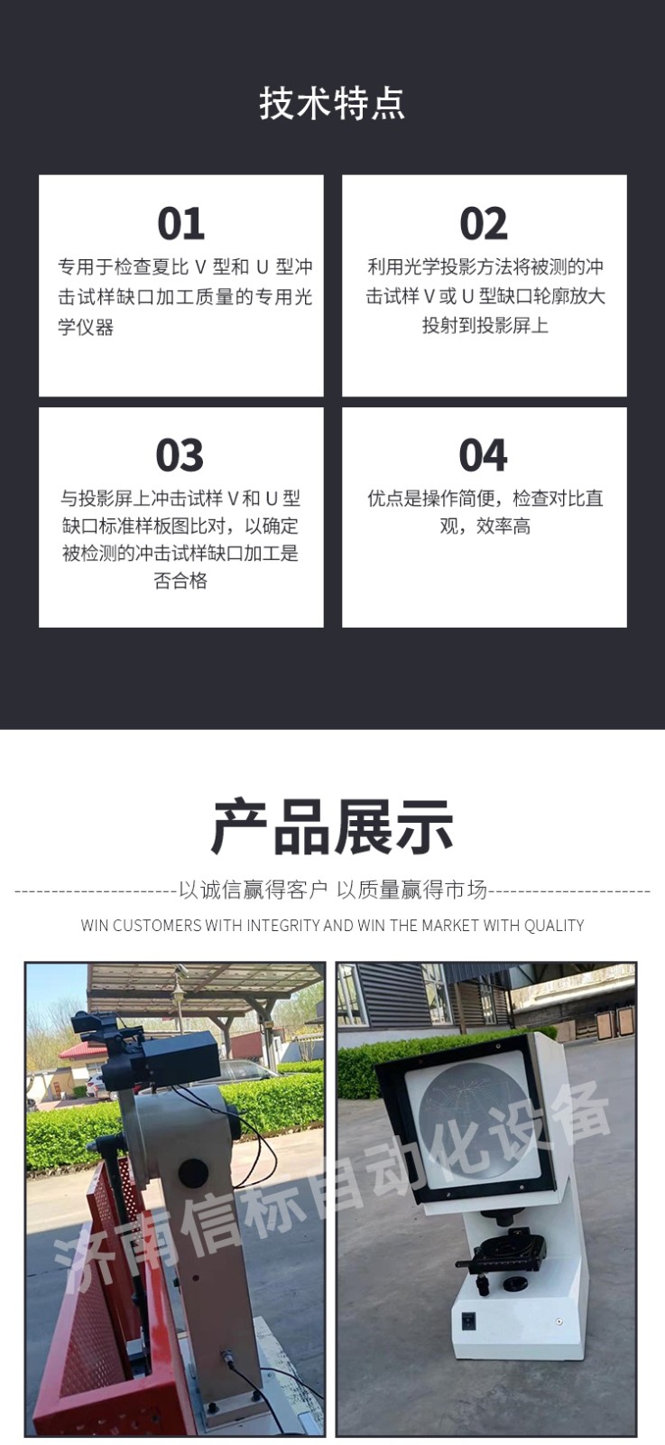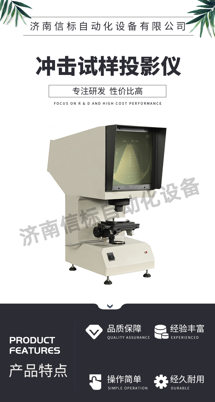 應用領域 CST-50型沖擊試樣缺口投影儀是我們根據(jù)目前國內(nèi)廣大用戶的實際需求和GB/T229-2020《金屬夏比擺錘沖擊試驗方法》中對沖擊試樣缺口的要求而設計、開發(fā)的一種專用于檢查夏比V型和U型沖擊試樣缺口加工質(zhì)量的專用光學儀器,該儀器是利用光學投影方法將被測的沖擊試樣V或U型缺口輪廓放大投射到投影屏上,與投影屏上沖擊試樣V和U型缺口標準樣板圖比對,以確定被檢測的沖擊試樣缺口加工是否合格,其優(yōu)點是操作簡便,檢查對比直觀,效率高。 三、主要技術(shù)指標: 1、投影屏直徑 :200*200mm 2、工作臺尺寸 : 方工作臺尺寸:110×125mm 方工作臺直徑:90mm 工作臺玻璃直徑:70mm 3、工作臺行程 : 縱向:±10mm 橫向:±10mm 升降:±12mm 4、工作臺轉(zhuǎn)動范圍: 0~360° 5、儀器放大倍率:50X 物鏡放大倍率: 2.5X 投影物鏡放大倍率:20x 6、光源(鹵鎢燈):12V 100W 7、電源: 220V 50Hz 8、外形尺寸:515×224×603mm 9、重量: 20kg 四、設備主要配置: 1.CST-50投影儀主機 一臺 2.底座調(diào)整鈕 四個 3.電源線 一根 4.鹵鎢燈 二個 5.平板玻璃 一塊 五、工作條件 a、環(huán)境溫度0-25oC范圍內(nèi); b、相對濕度不大于85 %; c、周圍無腐蝕性介質(zhì)的環(huán)境中; d、安裝在平整的地面上; a、環(huán)境溫度0-25oC范圍內(nèi); b、相對濕度不大于85 %; c、周圍無腐蝕性介質(zhì)的環(huán)境中; d、安裝在平整的地面上;