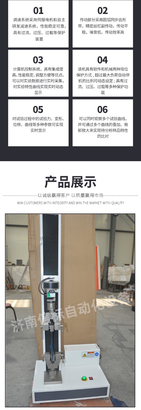 主要功能及特點(diǎn): 1、主機(jī): 1.1調(diào)速系統(tǒng)采用伺服電機(jī)和自主研發(fā)減速系統(tǒng),性能穩(wěn)定可靠,具有過流、過壓、過載等保護(hù)裝置。調(diào)速范圍可達(dá)0.05~500mm/min。 1.2傳動(dòng)部分采用圓弧同步齒形帶,精密絲杠副傳動(dòng),傳動(dòng)平穩(wěn),噪音低,傳動(dòng)效率高。 1.3萬向節(jié)采用十字插銷結(jié)構(gòu),而且具有擺角限制功能,一方面便于試樣夾持,保證試驗(yàn)同心度,另一方面很好的消除了不規(guī)則試樣對傳感器的影響。 2、控制系統(tǒng)、操作軟件及數(shù)據(jù)處理系統(tǒng) 2.1計(jì)算機(jī)控制系統(tǒng),具有集成度高、性能穩(wěn)定、調(diào)整方便等優(yōu)點(diǎn)??梢詫?shí)驗(yàn)數(shù)據(jù)進(jìn)行實(shí)時(shí)采集,對實(shí)驗(yàn)特性曲線實(shí)現(xiàn)實(shí)時(shí)動(dòng)態(tài)顯示,試驗(yàn)數(shù)據(jù)文件能以Access常用數(shù)據(jù)庫或SQLserve大型數(shù)據(jù)庫的方式保存,方便實(shí)現(xiàn)客戶的資源共享及網(wǎng)絡(luò)管理,以及用戶的再分析。對于用戶自定義的各種word2000報(bào)表,該軟件可輕松實(shí)現(xiàn)訪問,解決了不同用戶或同一用戶在不同時(shí)期對試驗(yàn)報(bào)表有不同需要的難題。該軟件可處理試驗(yàn)力、位移、 時(shí)間、變形的原始數(shù)據(jù)及由此派生的曲線。 2.2保護(hù)功能:該機(jī)具有軟件和機(jī)械兩種限位保護(hù)方式,超過最大負(fù)荷自動(dòng)停機(jī)的比例可動(dòng)態(tài)設(shè)定;具有過流、過壓、過載等多種保護(hù)功能。 2.3對于負(fù)荷、變形通道可實(shí)現(xiàn)自動(dòng)標(biāo)示,直觀方便。 2.4批量試驗(yàn)可實(shí)現(xiàn)曲線的分層次顯示,曲線自動(dòng)跟隨。 2.5該軟件可實(shí)現(xiàn)用戶自定義的速度設(shè)定,速度的計(jì)算機(jī)調(diào)整。還可實(shí)現(xiàn)高精度的速度標(biāo)定,隨時(shí)調(diào)整速度檔位和編碼。