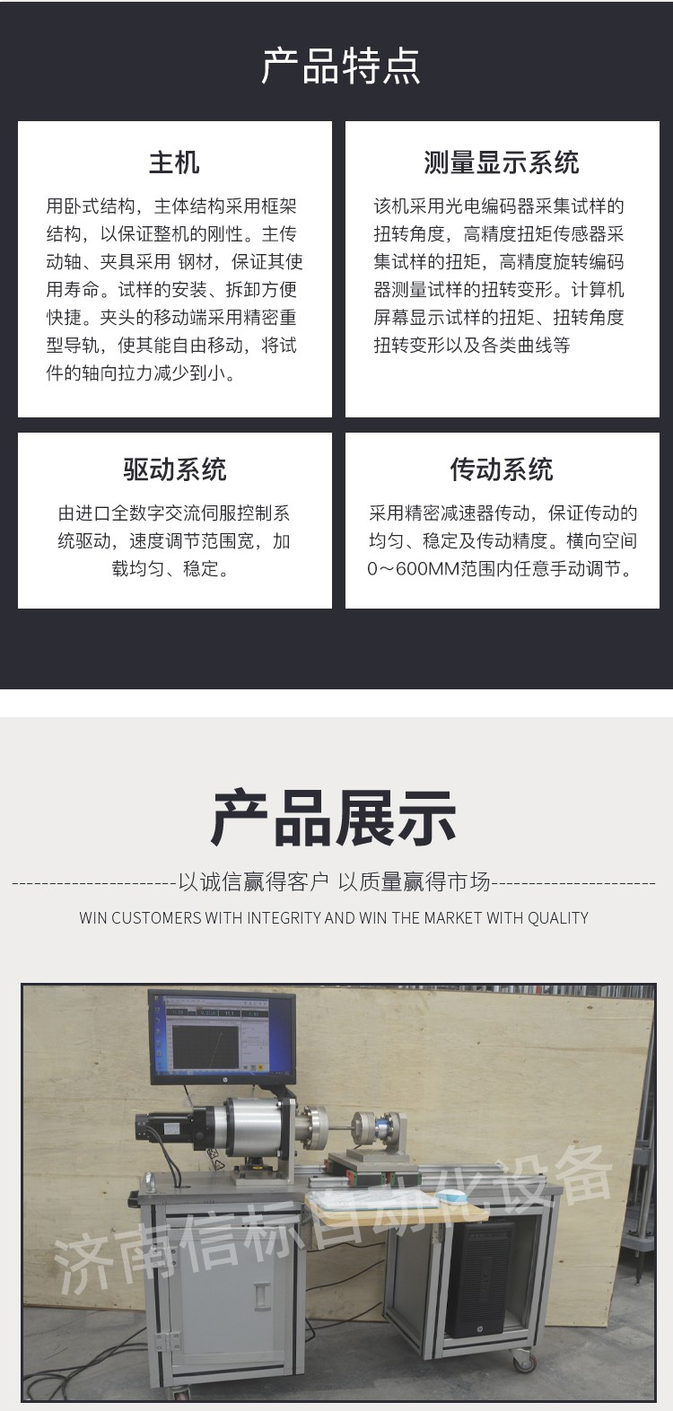 減速機(jī)扭矩試驗(yàn)機(jī) 減速機(jī)靜扭試驗(yàn)機(jī)產(chǎn)品特點(diǎn): 1、主機(jī):采用臥式結(jié)構(gòu),主體結(jié)構(gòu)采用框架結(jié)構(gòu),以保證整機(jī)的剛性。主傳動軸、夾具采用 鋼材,保證其使用壽命。試樣的安裝、拆卸方便、快捷。夾頭的移動端采用精密重型導(dǎo)軌,使其能自由移動,將試件的軸向拉力減少到 小。 2、驅(qū)動系統(tǒng):由進(jìn)口全數(shù)字交流伺服控制系統(tǒng)驅(qū)動,速度調(diào)節(jié)范圍寬,加載均勻、穩(wěn)定。 3、傳動系統(tǒng):采用精密減速器傳動,保證傳動的均勻、穩(wěn)定及傳動精度。橫向空間0~600mm范圍內(nèi)任意手動調(diào)節(jié)。 4、測量顯示系統(tǒng):該機(jī)采用光電編碼器采集試樣的扭轉(zhuǎn)角度,高精度扭矩傳感器采集試樣的扭矩,高精度旋轉(zhuǎn)編碼器測量試樣的扭轉(zhuǎn)變形。計(jì)算機(jī)屏幕顯示試樣的扭矩、扭轉(zhuǎn)角度、扭轉(zhuǎn)變形以及各類曲線等。 技術(shù)指標(biāo): 1. 加載*扭矩:0-500N.m 2. 扭矩測量范圍:4-500N.m 3. 扭矩分辨力 扭矩的1/±300000,全程不分檔 4. 扭矩示值相對誤差:優(yōu)于±1%(正反兩個(gè)方向) 5. 旋轉(zhuǎn)驅(qū)動電機(jī):3kW 6. 輸入端驅(qū)動轉(zhuǎn)速:50-3000rpm 7. 扭轉(zhuǎn)角測量范圍:無限制 8. 扭轉(zhuǎn)角示值相對誤差:示值精度的±1%以內(nèi) 9. 小角度測量精度:±0.5% 10.小角度測量分辨力:0.001° 11.輸出端加載扭轉(zhuǎn)速度:0.05-720°/min,無級調(diào)速,任意設(shè)定 12.扭轉(zhuǎn)速度相對誤差:設(shè)定值的±1.0%以內(nèi) 13.同軸度:Ф0.2mm以內(nèi) 14.電源電壓:AC220V 50Hz 15.扭轉(zhuǎn)方向:正轉(zhuǎn) 反轉(zhuǎn) 技術(shù)參數(shù): 1分辨率:0.001 2測量精度:1級 3加工定制:是 4電源電壓:220v 5規(guī)格:NDW-500J 6重量:500kg 7測量范圍:0-500nm 8外形尺寸:2100*1200*850mm