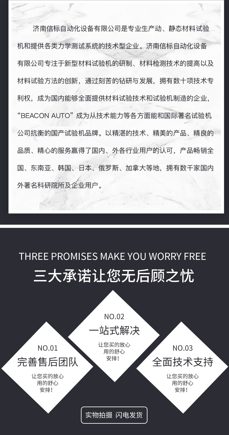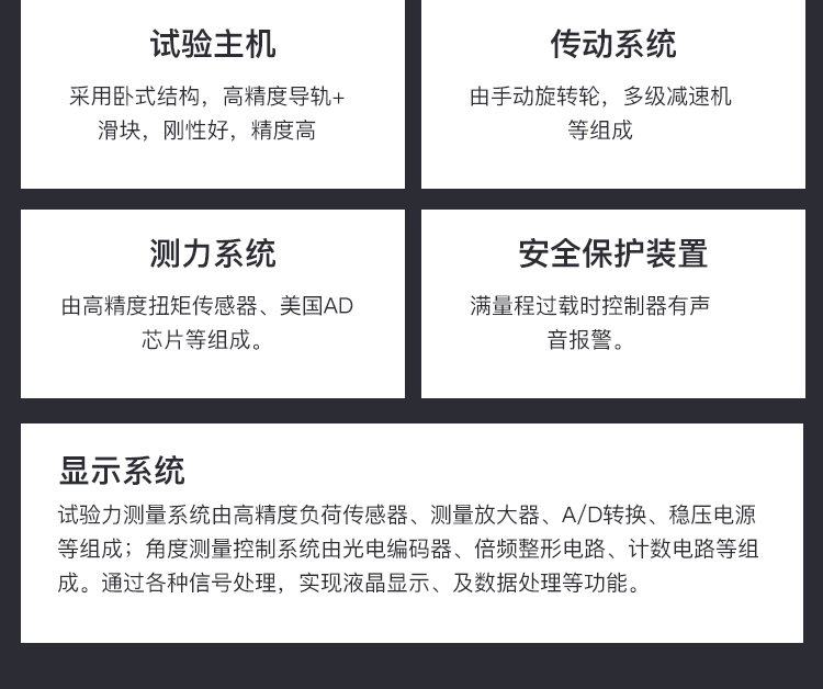 二、系統(tǒng)配置 1.主機(jī)一臺(tái); 2.高精密導(dǎo)軌+滑塊二副; 3.減速系統(tǒng)一套 4.高精度負(fù)荷傳感器一只; 5.噴塑外殼一套 6.電源線、數(shù)據(jù)線各一根 7.地腳螺栓一套 8.試驗(yàn)工具一套 9.扭轉(zhuǎn)附具一套 10.說明書、合格證、裝箱單各一份 11.全數(shù)字MCU控制系統(tǒng)一套;