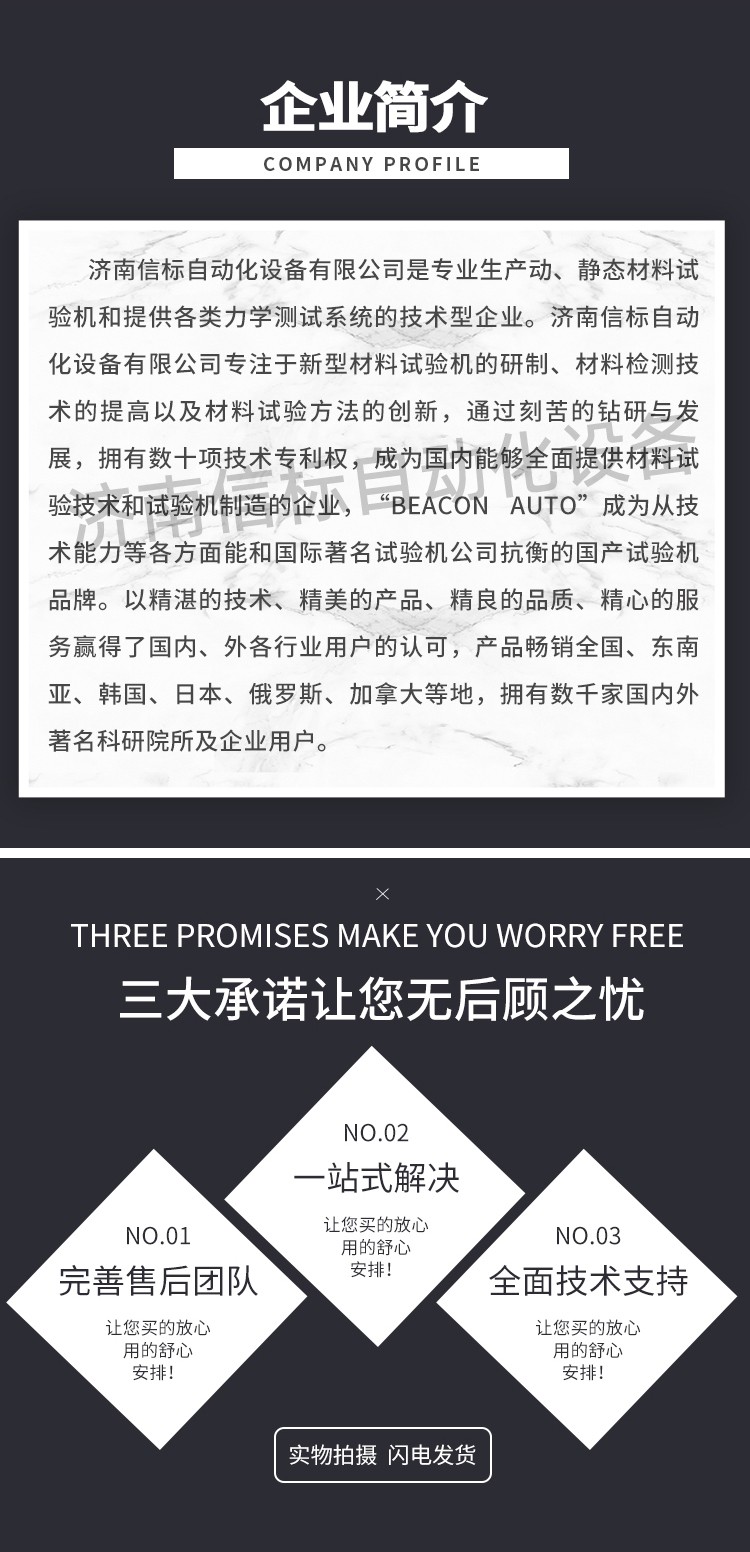 濟南信標自動化設備有限公司主要生產(chǎn):動靜態(tài)萬能疲勞試驗機,接骨板彎曲試驗機,縫合線拉伸疲勞試驗機,髖膝關(guān)節(jié)磨損試驗機,電子萬能試驗機、液壓萬能試驗機、巖石三軸、四軸,電液拉力試驗機,材料試驗機,高低溫蠕變,高低頻疲勞,拉伸、扭轉(zhuǎn)、杯突等二十多個系列兩千多個的品種。