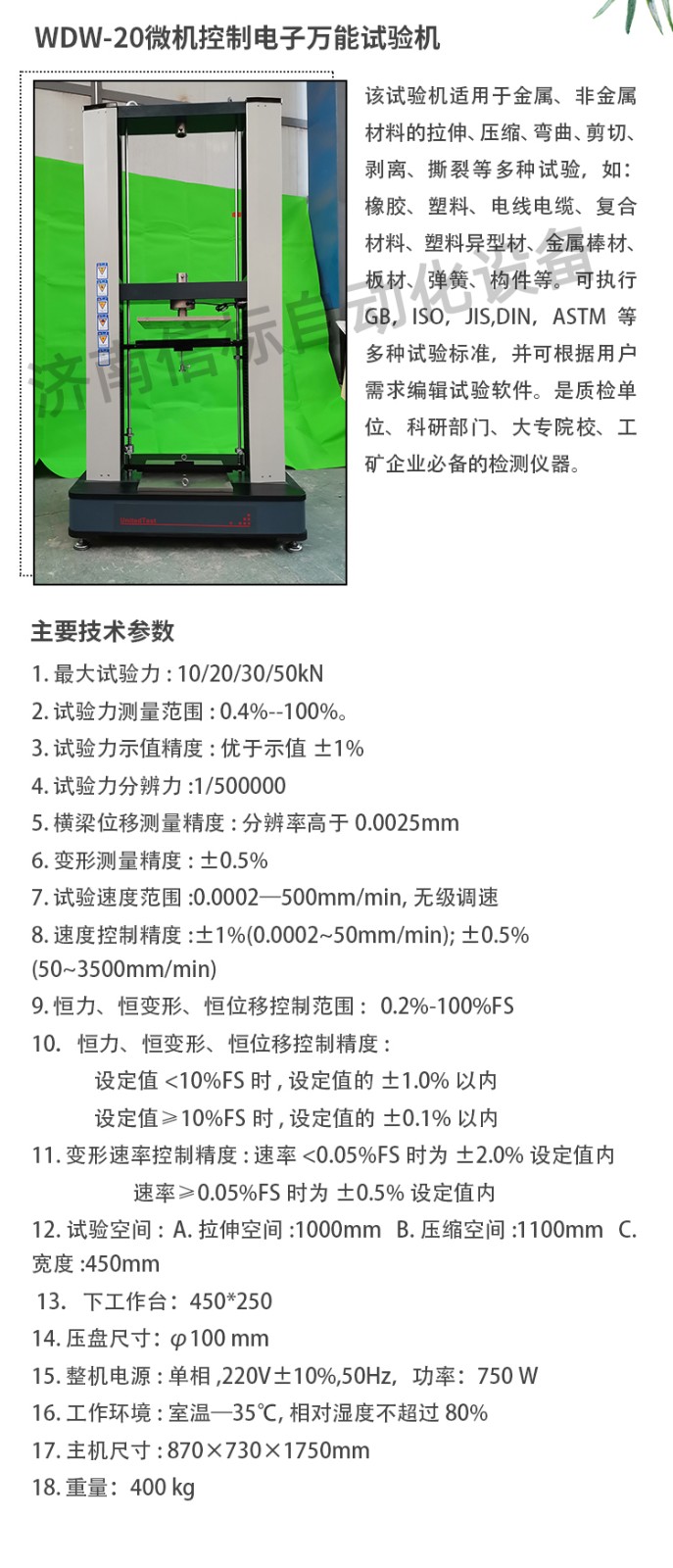 測(cè)量參數(shù): 1. 最大試驗(yàn)力: 10/20/30/50kN 2. 試驗(yàn)力測(cè)量范圍: 0.4%--100%。 3. 試驗(yàn)力示值精度:優(yōu)于示值±1% 4. 試驗(yàn)力分辨力:1/500000 5. 橫梁位移測(cè)量精度:分辨率高于0.0025mm 6. 變形測(cè)量精度: ±0.5% 7. 試驗(yàn)速度范圍:0.0002—500mm/min,無(wú)級(jí)調(diào)速 8. 速度控制精度:±1%(0.0002~50mm/min); ±0.5%(50~3500mm/min) 9. 恒力、恒變形、恒位移控制范圍: 0.2%-100%FS 10.恒力、恒變形、恒位移控制精度: 設(shè)定值<10%FS時(shí),設(shè)定值的±1.0%以內(nèi) 設(shè)定值≥10%FS時(shí),設(shè)定值的±0.1%以內(nèi) 11. 變形速率控制精度: 速率<0.05%FS時(shí)為±2.0%設(shè)定值內(nèi) 速率≥0.05%FS時(shí)為±0.5%設(shè)定值內(nèi) 12. 試驗(yàn)空間: A.拉伸空間:1000mm B.壓縮空間:1100mm C.寬度:450mm 13.下工作臺(tái):450*250 14. 壓盤尺寸:φ100 mm 15. 整機(jī)電源:單相,220V±10%,50Hz,功率:750 W 16. 工作環(huán)境:室溫—35℃,相對(duì)濕度不超過(guò)80% 17. 主機(jī)尺寸: 870×730×1750mm 18. 重量:400 kg 產(chǎn)品配置: 1、主機(jī) 一套 2、松下A7全數(shù)字伺服電機(jī)及伺服驅(qū)動(dòng)器; 一套 3、高精度負(fù)荷傳感器; 5kn/1kn/500N/200/ 各一支 4、Hiwin精密滾珠絲杠; 2支 5、光電編碼器(2500線,內(nèi)置); 1支 6、夾具:滿足海綿/汽車座椅所需工裝 1套(有多種) 7、三閉環(huán)測(cè)量系統(tǒng)一套,采用力,位移,應(yīng)變等多種控制方式,試驗(yàn)過(guò)程中可實(shí)時(shí)顯示力-位移,力-時(shí)間,應(yīng)力-應(yīng)變等多種試驗(yàn)曲線,并可自動(dòng)得出最大負(fù)荷,拉伸強(qiáng)度,斷裂伸長(zhǎng)率等多種 結(jié)果參數(shù)。 8、HP品牌計(jì)算機(jī),21寸液晶顯示器; 9、打印機(jī):HPA4彩色噴墨打印機(jī); 10、專用試驗(yàn)軟件:可執(zhí)行GB,ISO,JIS、DIN,ASTM等多種試驗(yàn)標(biāo)準(zhǔn),全開(kāi)放式,功能強(qiáng)大,方便操作,免費(fèi)提供升級(jí)軟件,并可根據(jù)用戶需求自行編輯試驗(yàn)軟件。