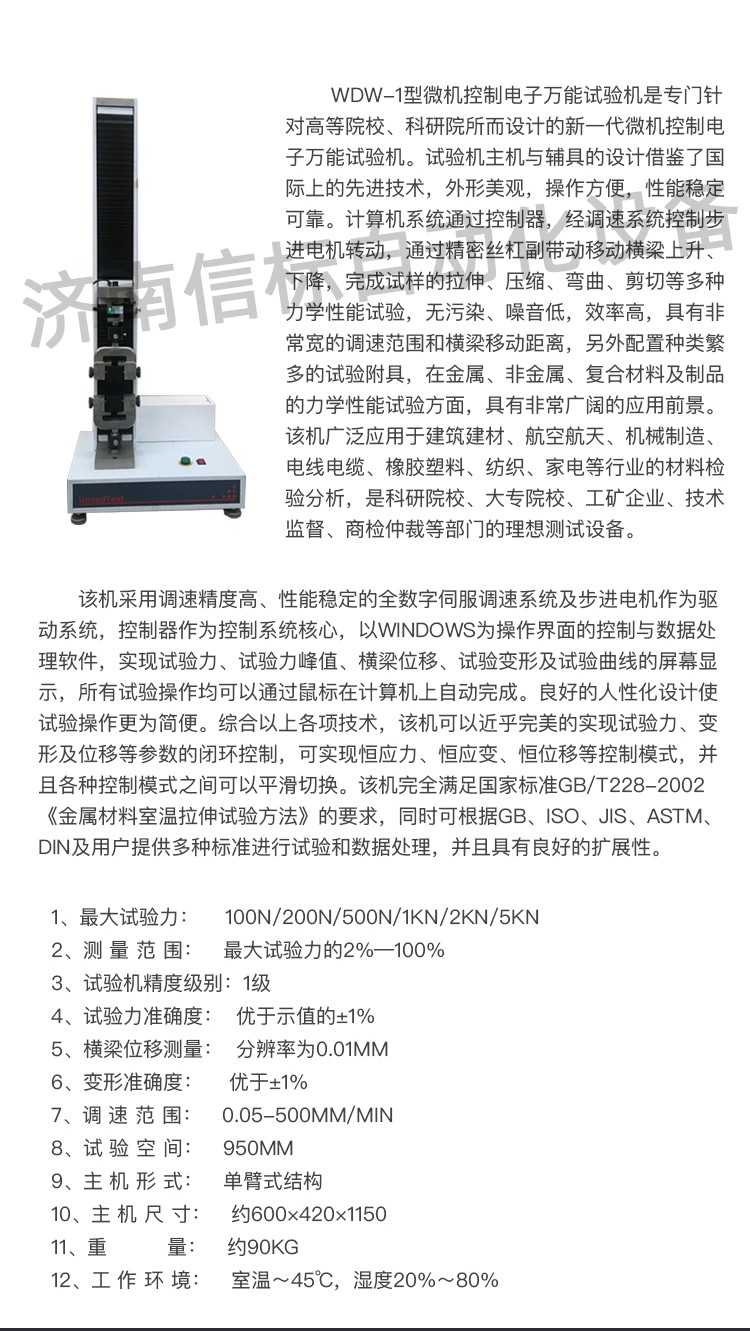 金屬材料壓縮彎曲實(shí)驗(yàn)口罩塑料拉伸強(qiáng)度試驗(yàn)機(jī)主要技術(shù)指標(biāo): 1、最大試驗(yàn)力: 100N/200N/500N/1KN/2KN/5KN 2、測 量 范 圍: 最大試驗(yàn)力的2%—100% 3、試驗(yàn)機(jī)精度級(jí)別:1級(jí) 4、試驗(yàn)力準(zhǔn)確度: 優(yōu)于示值的±1% 5、橫梁位移測量: 分辨率為0.01mm 6、變形準(zhǔn)確度: 優(yōu)于±1% 7、調(diào) 速 范 圍: 0.05-500mm/min 8、試 驗(yàn) 空 間: 950mm 9、主 機(jī) 形 式: 單臂式結(jié)構(gòu) 10、主 機(jī) 尺 寸: 約600×420×1150 11、重 量: 約90Kg 12、工 作 環(huán) 境: 室溫~45℃,濕度20%~80%