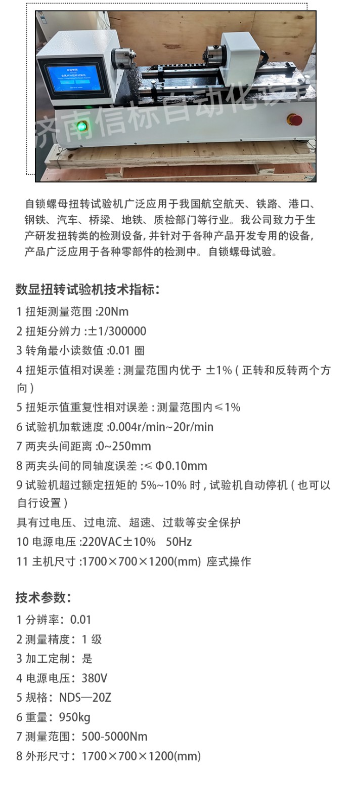 數(shù)顯扭轉(zhuǎn)試驗機(jī)技術(shù)指標(biāo): 1 扭矩測量范圍:20Nm 2 扭矩分辨力:±1/300000 3 轉(zhuǎn)角最小讀數(shù)值:0.01圈 4 扭矩示值相對誤差:測量范圍內(nèi)優(yōu)于±1% (正轉(zhuǎn)和反轉(zhuǎn)兩個方向) 5 扭矩示值重復(fù)性相對誤差:測量范圍內(nèi)≤1% 6 試驗機(jī)加載速度:0.004r/min~20r/min 7 兩夾頭間距離:0~250mm 8 兩夾頭間的同軸度誤差:≤Φ0.10mm 9 試驗機(jī)超過額定扭矩的5%~10%時,試驗機(jī)自動停機(jī)(也可以自行設(shè)置) 具有過電壓、過電流、超速、過載等安全保護(hù) 10 電源電壓:220VAC±10% 50Hz 11 主機(jī)尺寸:1700×700×1200(mm) 座式操作 功能特點: 1、適用于WINDOWS平臺的中文試驗軟件,實現(xiàn)試驗數(shù)據(jù)采集處理。 2、可實時采集試驗數(shù)據(jù)、運算處理、實時顯示并打印結(jié)果報告。 3、曲線遍歷:可用鼠標(biāo)對曲線數(shù)據(jù)逐點訪問,以便求取各種數(shù)據(jù)。扭矩與扭角關(guān)系曲線中能反映任意點扭矩—角度的關(guān)系,能方便地在曲線上找到所求數(shù)據(jù)點;可方便地對曲線局部放大還原等。 4、根據(jù)需要可隨時對扭矩、角度測量通道進(jìn)行手動或自動清零。 5、自動存盤:試驗條件、試驗數(shù)據(jù)自動存盤,需要時可隨時調(diào)出。 6、批量試驗:試驗條件設(shè)定后,可依次完成一批樣品的試驗,試驗條件、試樣參數(shù)、測試數(shù)據(jù)、結(jié)果可存儲,隨時調(diào)用,再次試驗無須設(shè)置。 7、打印試驗報表。