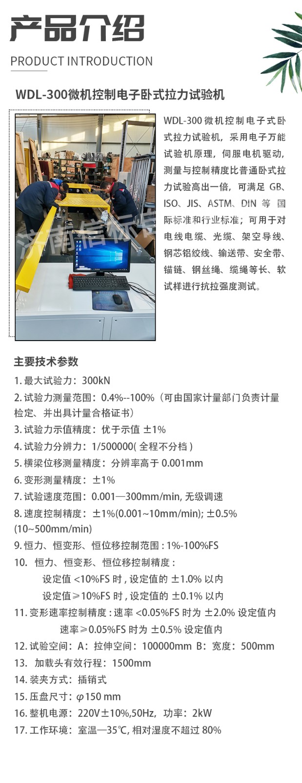 試驗(yàn)標(biāo)準(zhǔn): GB/T 8358-2014 鋼絲繩實(shí)際破斷拉力測定方法 GB∕T 1179-2008 圓線同心絞架空導(dǎo)線 DL/T 832-2003 光纖復(fù)合架空地線 DL/T 788-2001 全介質(zhì)自承式光纜 GB/T 7424.4-2003 光纜 第4部分:分規(guī)范 光纖復(fù)合架空地線 IEC 60794.4-2009 光纜 第4部分:分規(guī)范 輸電線架空光纜 IEEE 1138-2009 電力事業(yè)用電線的復(fù)合光纖架空地線的建造標(biāo)準(zhǔn) GB/T16491-2008 電子式萬能試驗(yàn)機(jī) GB/T228.1-2010 金屬材料室溫拉伸試驗(yàn) GB/T4909.3-2009 裸電線試驗(yàn)方法 第3部分:拉力試驗(yàn) GB/T14049-2008 額定電壓10KV架空絕緣電纜 GB/T12527-2008 額定電壓1KV及以下架空絕緣電纜 GB/T3955-2009 電工圓鋁線 GB/T17048-2009 架空絞線用鋁線 GB/T17939-2009 電工用鋁包鋼線 GB/T3428/2012 架空絞線用鍍鋅鋼線 三、主要技術(shù)指標(biāo): 1. 最大試驗(yàn)力:300kN 2. 試驗(yàn)力測量范圍:0.4%--100% (可由國家計量部門負(fù)責(zé)計量檢定、并出具計量合格證書) 3. 試驗(yàn)力示值精度:優(yōu)于示值±1% 4. 試驗(yàn)力分辨力:1/500000(全程不分檔) 5. 橫梁位移測量精度:分辨率高于0.001mm 6. 變形測量精度:±1% 7. 試驗(yàn)速度范圍:0.001—300mm/min,無級調(diào)速 8. 速度控制精度:±1%(0.001~10mm/min); ±0.5%(10~500mm/min) 9. 恒力、恒變形、恒位移控制范圍: 1%-100%FS 10.恒力、恒變形、恒位移控制精度: 設(shè)定值<10%FS時,設(shè)定值的±1.0%以內(nèi) 設(shè)定值≥10%FS時,設(shè)定值的±0.1%以內(nèi) 11. 變形速率控制精度: 速率<0.05%FS時為±2.0%設(shè)定值內(nèi) 速率≥0.05%FS時為±0.5%設(shè)定值內(nèi) 12. 試驗(yàn)空間: A:拉伸空間:100000mm B:寬度:500mm 13.加載頭有效行程:1500mm 14. 裝夾方式:插銷式 15. 壓盤尺寸:φ150 mm 16. 整機(jī)電源:220V±10%,50Hz,功率:2kW 17. 工作環(huán)境:室溫—35℃,相對濕度不超過80%