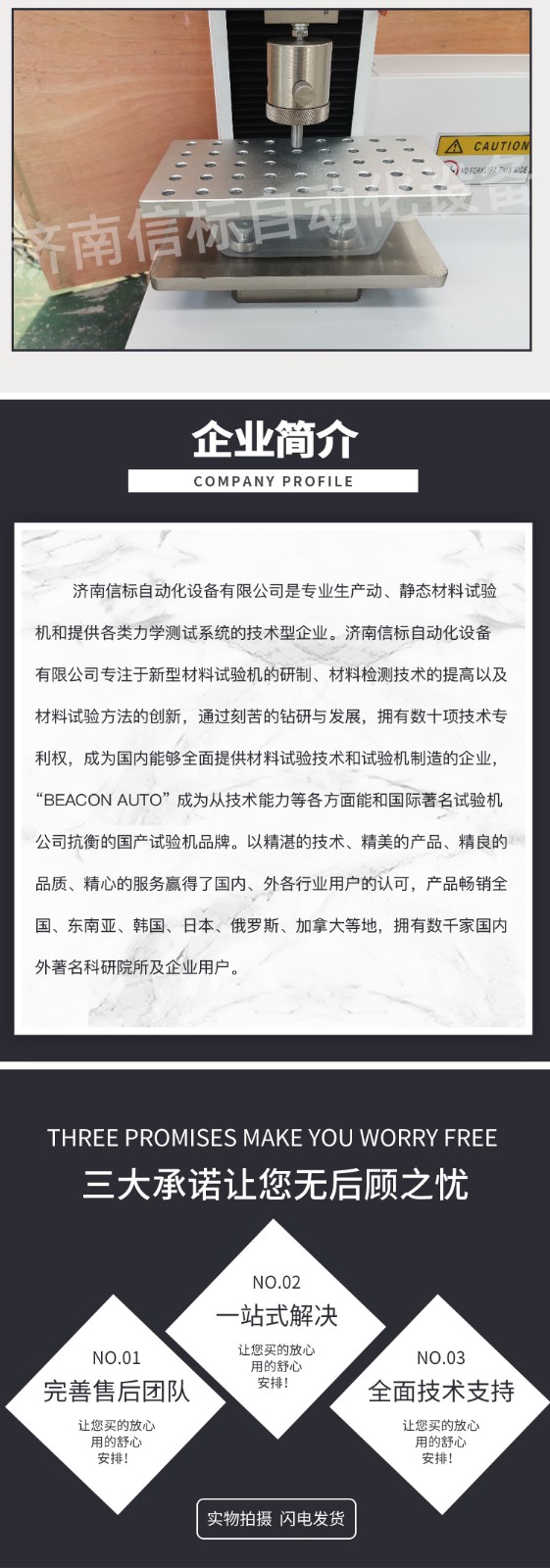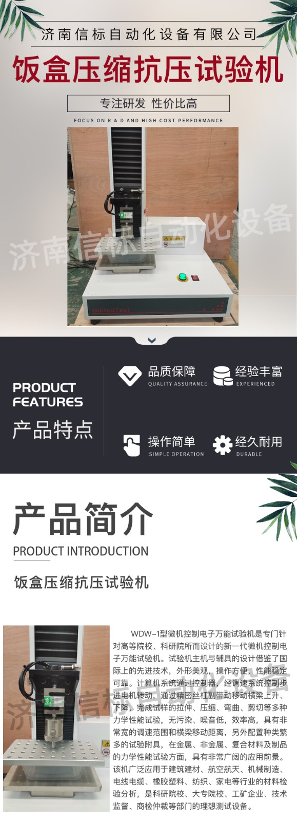 飯盒壓縮抗壓試驗(yàn)機(jī) 單臂壓力萬(wàn)能試驗(yàn)機(jī)主要技術(shù)指標(biāo): 1、 最大試驗(yàn)力: 100N/200N/500N/1KN/2KN/5KN 2、 測(cè) 量 范 圍: 最大試驗(yàn)力的2%—100% 3、 試驗(yàn)機(jī)精度級(jí)別:1級(jí) 4、 試驗(yàn)力準(zhǔn)確度: 優(yōu)于示值的±1% 5、 橫梁位移測(cè)量: 分辨率為0.01mm 6、 變形準(zhǔn)確度: 優(yōu)于±1% 7、 調(diào) 速 范 圍: 0.05-500mm/min 8、 試 驗(yàn) 空 間: 950mm 9、 主 機(jī) 形 式: 單臂式結(jié)構(gòu) 10、 主 機(jī) 尺 寸: 約600×420×1150 11、 重 量: 約90Kg 12、 工 作 環(huán) 境: 室溫~45℃,濕度20%~80% 飯盒壓縮抗壓試驗(yàn)機(jī) 單臂壓力萬(wàn)能試驗(yàn)機(jī)主要功能及特點(diǎn): 主機(jī): 1.1調(diào)速系統(tǒng)采用伺服電機(jī)和自主研發(fā)減速系統(tǒng),性能穩(wěn)定可靠,具有過(guò)流、過(guò)壓、過(guò)載等保護(hù)裝置。調(diào)速范圍可達(dá)0.05~500mm/min。 1.2傳動(dòng)部分采用圓弧同步齒形帶,精密絲杠副傳動(dòng),傳動(dòng)平穩(wěn),噪音低,傳動(dòng)效率高。 1.3萬(wàn)向節(jié)采用十字插銷(xiāo)結(jié)構(gòu),而且具有擺角限制功能,一方面便于試樣夾持,保證試驗(yàn)同心度,另一方面很好的消除了不規(guī)則試樣對(duì)傳感器的影響。 2、控制系統(tǒng)、操作軟件及數(shù)據(jù)處理系統(tǒng) 2.1計(jì)算機(jī)控制系統(tǒng),具有集成度高、性能穩(wěn)定、調(diào)整方便等優(yōu)點(diǎn)??梢詫?duì)實(shí)驗(yàn)數(shù)據(jù)進(jìn)行實(shí)時(shí)采集,對(duì)實(shí)驗(yàn)特性曲線(xiàn)實(shí)現(xiàn)實(shí)時(shí)動(dòng)態(tài)顯示,試驗(yàn)數(shù)據(jù)文件能以Access常用數(shù)據(jù)庫(kù)或SQLserve大型數(shù)據(jù)庫(kù)的方式保存,方便實(shí)現(xiàn)客戶(hù)的資源共享及網(wǎng)絡(luò)管理,以及用戶(hù)的再分析。對(duì)于用戶(hù)自定義的各種word2000報(bào)表,該軟件可輕松實(shí)現(xiàn)訪(fǎng)問(wèn),解決了不同用戶(hù)或同一用戶(hù)在不同時(shí)期對(duì)試驗(yàn)報(bào)表有不同需要的難題。該軟件可處理試驗(yàn)力、位移、 時(shí)間、變形的原始數(shù)據(jù)及由此派生的曲線(xiàn)。