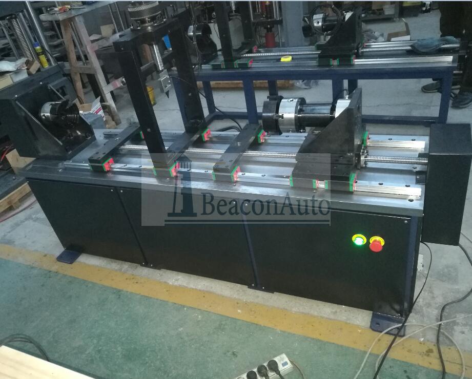 主要技術(shù)指標(biāo) 試驗及級別:1級 最大拉伸試驗力: 10000N 最大試驗扭矩: 50 Nm 最大徑向試驗力: 500N 位移最小讀數(shù):0.01mm 位移最大讀數(shù):600.00mm 角位移最大讀數(shù):999.99度 角位移最小讀數(shù):0.1度 最大行程:1200mm 電源:220V 50Hz 扭轉(zhuǎn)部分: 1.軸流風(fēng)扇靜態(tài)扭轉(zhuǎn)試驗機項目簡介 扭轉(zhuǎn)部分是由加載系統(tǒng)、傳動系統(tǒng)、數(shù)字式數(shù)據(jù)采集處理系統(tǒng)及計算機測量控制顯示系統(tǒng)等組成,適用于對軸流風(fēng)扇靜態(tài)扭轉(zhuǎn)力學(xué)的性能測試。該機采用落地臥式結(jié)構(gòu)。計算機屏幕顯示,數(shù)字式數(shù)據(jù)采集控制系統(tǒng)和全數(shù)字交流伺服系統(tǒng)組成閉環(huán)控制。采用行星擺線針輪減速器傳動,具有加載均勻、穩(wěn)定、無沖擊現(xiàn)象、數(shù)據(jù)采集控制準(zhǔn)確的特點。 試驗測試功能:Win2000/XP中文操作平臺。使用以圖形為界面的視窗式操作系統(tǒng),可設(shè)定顯示屏幕及操作面板;可設(shè)定試驗速度及各種控制參數(shù);可實時顯示基本試驗結(jié)果(斷裂值、峰值);可實時顯示試驗過程各種相關(guān)參數(shù)圖形;可實現(xiàn)系統(tǒng)診斷并顯示診斷結(jié)果。試驗機實現(xiàn)分級管理權(quán)限。不同的用戶可進入不同的管理界面、分三級用戶管理權(quán)限。 整機利用全數(shù)字交流伺服控制系統(tǒng)及數(shù)字式數(shù)據(jù)采集處理系統(tǒng),光電編碼器采集試樣的扭轉(zhuǎn)角度。 2.目的: 軸流風(fēng)扇的靜態(tài)扭轉(zhuǎn)實驗 3.軸流風(fēng)扇靜態(tài)扭轉(zhuǎn)試驗機方案描述 【主 機】采用臥式結(jié)構(gòu),主體結(jié)構(gòu)采用焊接結(jié)構(gòu),以保證整機的剛性。夾具采用優(yōu)質(zhì)合金結(jié)構(gòu)鋼40CrNiMoA淬火(HRC45~50)方式,主傳動軸采用優(yōu)質(zhì)合金結(jié)構(gòu)鋼淬火處理,保證其使用壽命。試樣的安裝、拆卸方便、快捷。 【驅(qū)動系統(tǒng)】由全數(shù)字交流伺服控制系統(tǒng)驅(qū)動。速度調(diào)節(jié)范圍寬,加載均勻、穩(wěn)定。 【傳動系統(tǒng)】采用行星擺線針輪減速器傳動,保證傳動的均勻、穩(wěn)定及傳動精度??v向空間可以根據(jù)汽車半軸的規(guī)格進行調(diào)整,橫向空間根據(jù)驅(qū)動橋的規(guī)格任意手動調(diào)節(jié)。 【測量顯示系統(tǒng)】該機采用光電編碼器采集試樣的扭轉(zhuǎn)角度,高精度扭矩傳感器采集試樣的扭矩。計算機屏幕顯示試樣的扭矩、扭轉(zhuǎn)角度、扭轉(zhuǎn)剛度以及各類曲線等。 【軟件操作】 ★控制模式采用智能專家設(shè)置系統(tǒng),用戶可以根據(jù)自己的實際要求編制試驗過程控制方式,自動完成試驗。 ★ Windows2000/XP全中文界面,人機對話方式。試驗的全部操作均借助CRT,通過計算機鍵盤與鼠標(biāo)完成,計算機屏幕顯示試驗扭矩T,扭轉(zhuǎn)角度θ,扭轉(zhuǎn)次數(shù),各種試驗曲線(扭矩-時間曲線、扭矩-角度曲線、角度-時間曲線等)試驗機工作狀態(tài)等。 ★曲線坐標(biāo)的大小可以根據(jù)實際的試驗數(shù)據(jù)進行調(diào)整。 ★輸出打印各種試驗報表格式(報表格式可以Excel或Word格式輸出)。 ★符合JB/T9370—1999《扭轉(zhuǎn)試驗機技術(shù)條件》及GB10128—88《金屬室溫扭轉(zhuǎn)試驗方法》數(shù)據(jù)處理的相關(guān)要求。 ★可以設(shè)定以正弦波或方波的方式進行循環(huán)加載。 ★ 試驗過程可以實現(xiàn)模擬再現(xiàn)。 ★ 可以任意多條試驗曲線疊加對比、輸出打印。 ★ 可以進行數(shù)字化調(diào)零和標(biāo)定。 ★ 試驗數(shù)據(jù)采用數(shù)據(jù)庫管理方式,便于查詢和維護。 ★ 軟件系統(tǒng)的操作可以實現(xiàn)三級用戶管理,安全、方便、快捷。 【安全保護系統(tǒng)】過載保護、過電流、過電壓保護、超速保護、工作值保護、行進保護等。 4.主要技術(shù)性能指標(biāo): 4. 1大輸出扭矩:±50Nm;測量范圍:±0.1~±50Nm 4. 2驗扭矩示值相對誤差:±1% 4.3試驗扭矩重復(fù)性相對示值誤差:≤1% 4.4扭矩測量范圍:1%~100% 4.5縱向空間:0~1200mm可調(diào) 4. 6轉(zhuǎn)角度分辯率:0.10; 4. 7加載方式:可以設(shè)定以一定速度或扭距進行持續(xù)加載。 4. 8加載速度:0.005~3r/min任意設(shè)定 4. 9加載控制精度為:±2% 4. 10壓電壓:AC380V 50Hz 5.軸流風(fēng)扇靜態(tài)扭轉(zhuǎn)試驗機功能要求: 5.1系統(tǒng)集成、加載、操作運行控制由計算機控制,試驗過程的數(shù)據(jù)采集、記錄由計算機完成,可以實現(xiàn)試驗數(shù)據(jù)回放,報表輸出; 5.2加載量在設(shè)備性能指標(biāo)的范圍內(nèi)連續(xù)可調(diào)穩(wěn)定輸出; 5.3試驗控制操作集中在控制臺(柜),采用單人坐式操作;試驗件安裝調(diào)整符合操作人員立式操作的要求;試驗工裝需要必要的旋轉(zhuǎn)功能,方便主減齒輪試驗時主減速器的安裝、拆卸; 二軸向及徑向加載部分 1.1全數(shù)字交流伺服電機和伺服驅(qū)動器,調(diào)速比可達(dá)1:30;該系統(tǒng)控制精度高、穩(wěn)定性好,運行平穩(wěn)可靠、響應(yīng)快、噪音低,并具有過載、過流、過壓、欠壓、過熱、 異常停止、故障報警等齊全的保護功能,并可根據(jù)不同的機型和試驗類型調(diào)整參數(shù),使伺服系統(tǒng)運行在最佳狀態(tài),使用了伺服系統(tǒng)的位置控制方式,接口單元